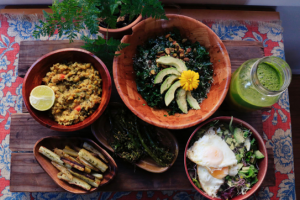 Because of the cold and dry nature of Vata, inducing foods with the opposite qualities (warm/unctuous) is good for balancing Vata. Scheduled meal times can be helpful. Use healthy oils and ghee in cooking, and raw uncooked food should be limited, as should cold beverages – especially during fall and winter.